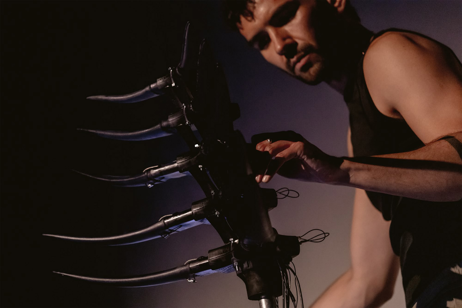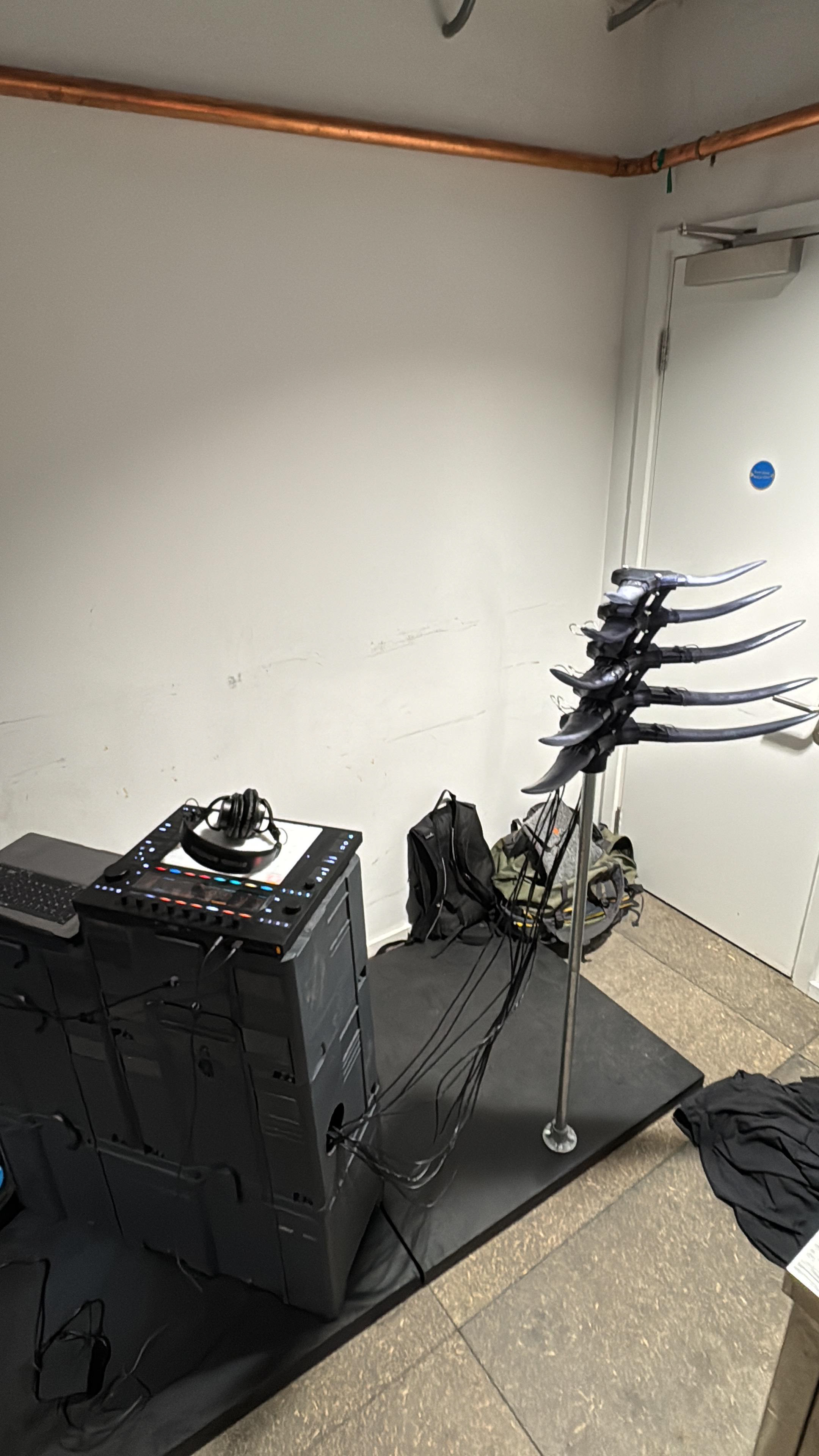 The instrument uses 10 ultrasonic distance sensors to capture data, which is mapped in Ableton to synth parameters and sample triggers.