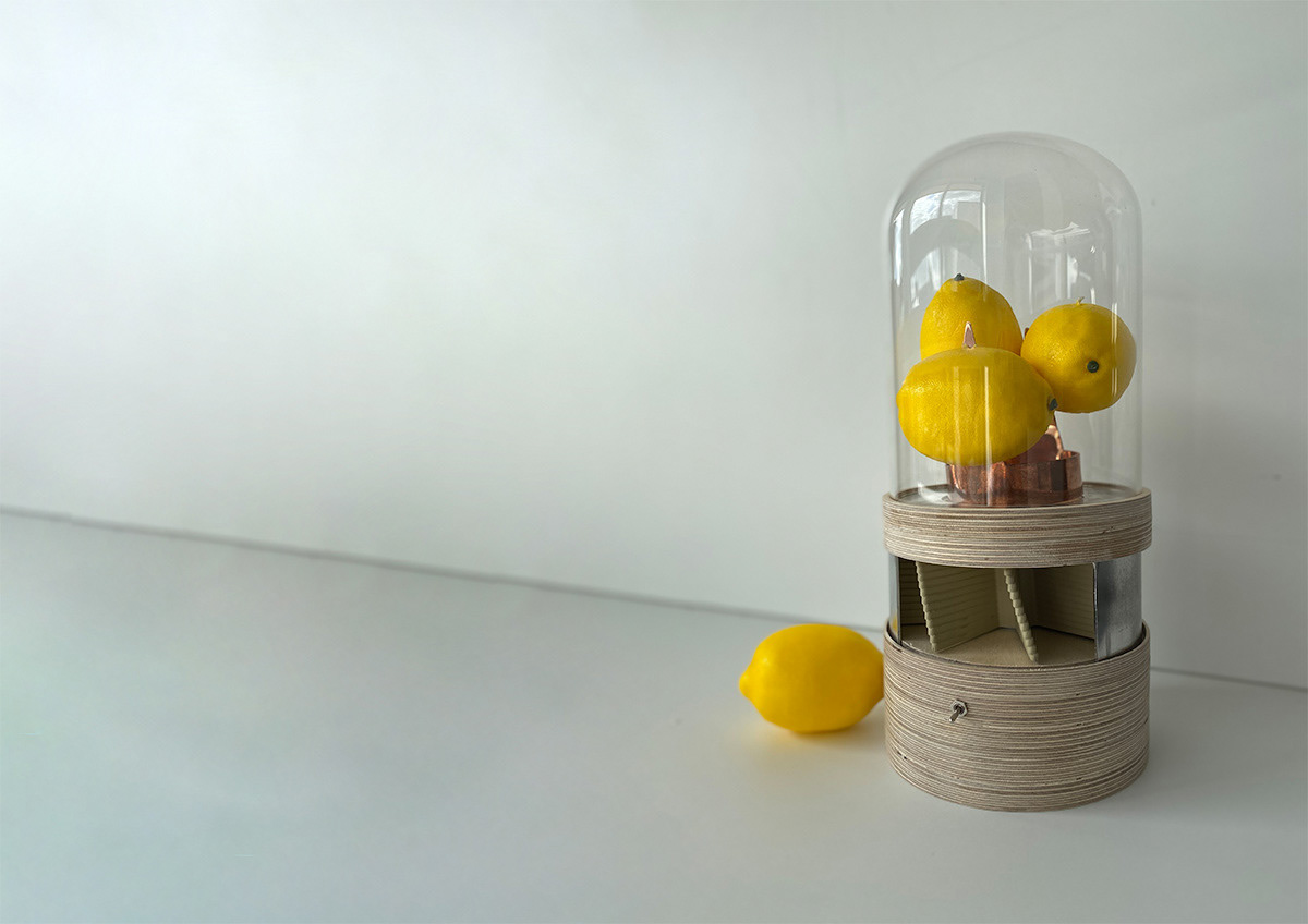 Speculative desk fan using the conductive properties of citrus fruits to generate electricity.