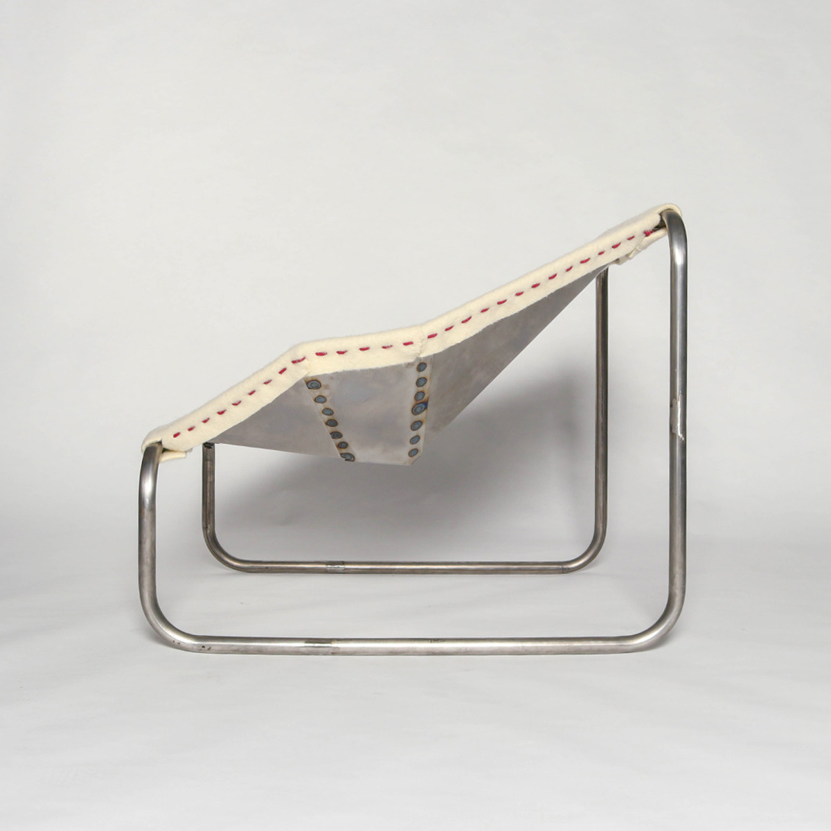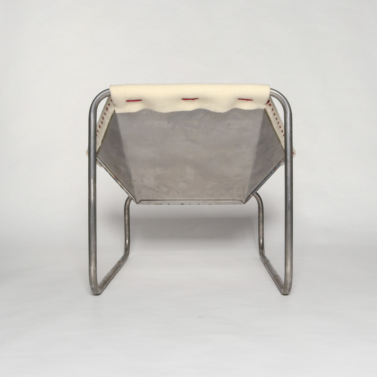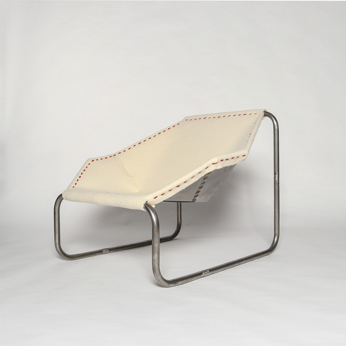 A tubular steel frame supporting a laser cut steel shell and upholstered in swanskin wool.